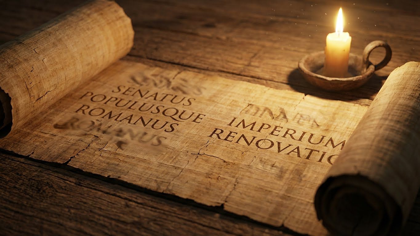 pergaminho romano antigo desenrolado sobre uma mesa de madeira, mostrando letras latinas sendo trocadas por outras