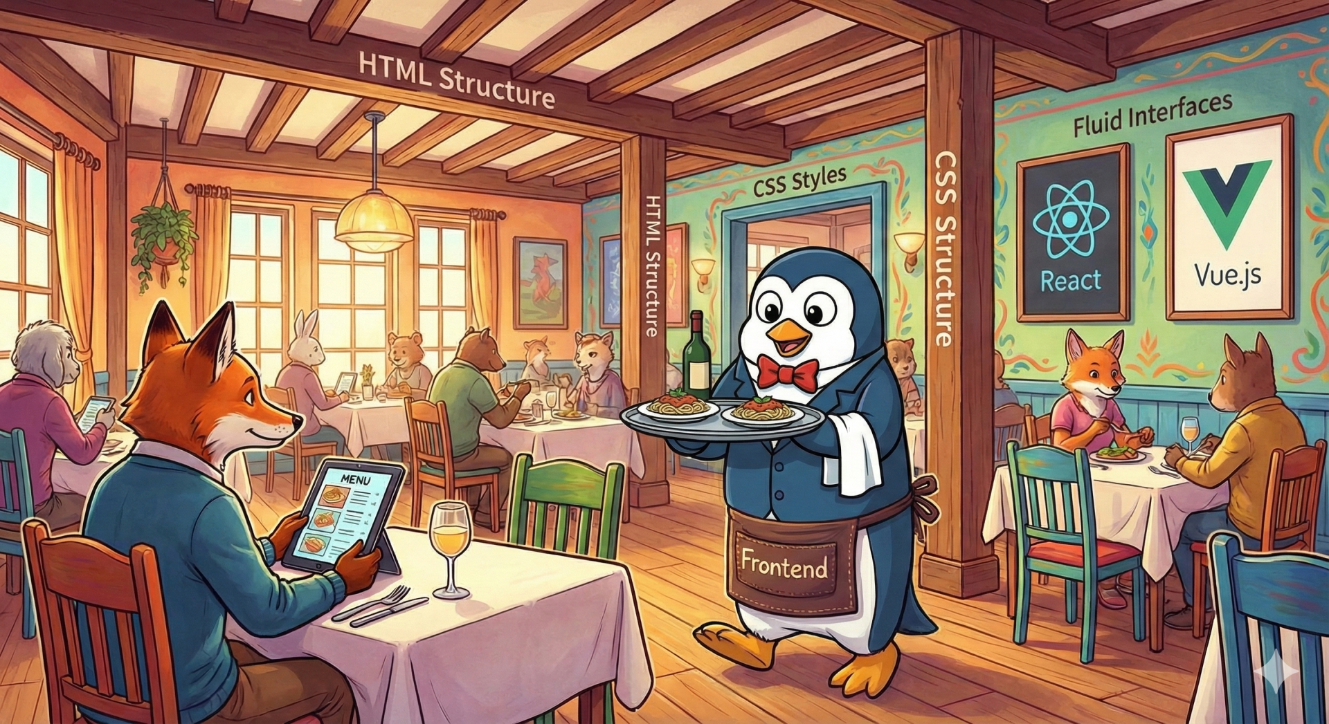 O Frontend é o salão do restaurante, o ambiente onde o cliente senta, interage e faz o pedido. No mundo digital, ele é a interface que roda no navegador ou no celular. É responsabilidade de tecnologias como HTML (estrutura), CSS (estilo) e frameworks modernos como React ou Vue.js garantir que essa experiência seja fluida, bonita e intuitiva. É a única parte do sistema que o usuário "vê".