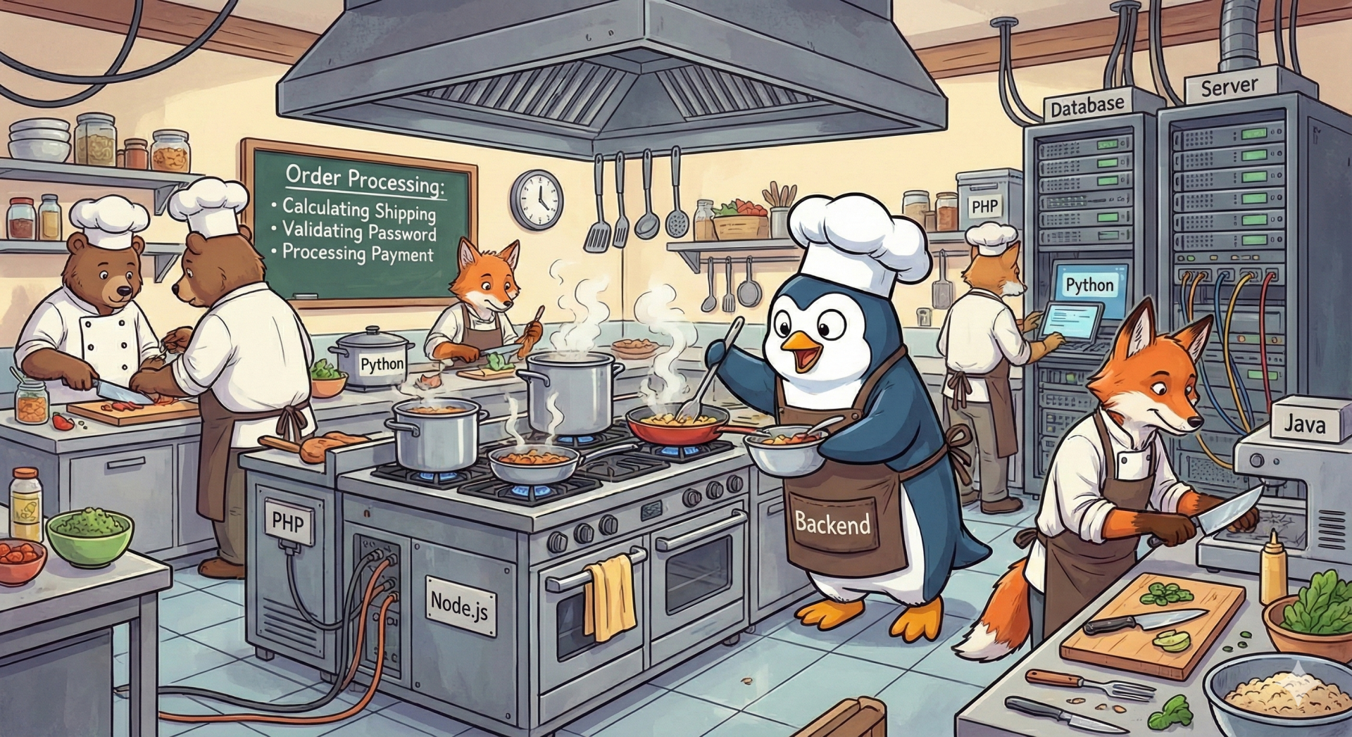 Enquanto o cliente admira o salão, a mágica pesada acontece longe dos olhos, na cozinha. O Backend é onde os pedidos são processados e as receitas são seguidas. É aqui que linguagens como PHP, Python, Node.js ou Java operam para executar as regras de negócio: calcular o frete, validar se a senha está correta ou processar um pagamento. Sem uma cozinha eficiente, o restaurante é apenas uma sala bonita, mas que não serve nada.