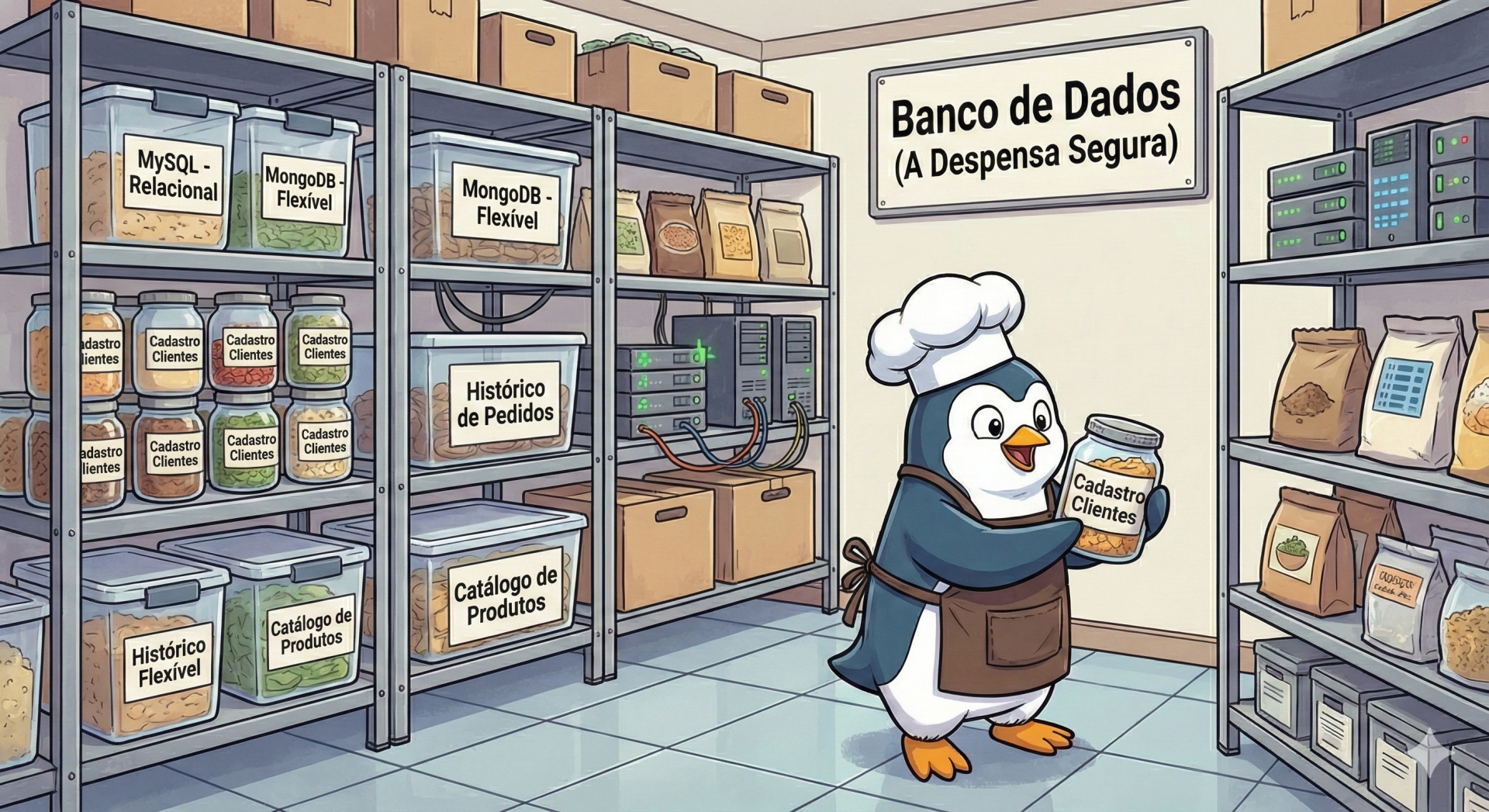 Toda cozinha precisa de ingredientes estocados de forma organizada para funcionar. O Banco de Dados é essa despensa segura. Seja usando um modelo relacional tradicional (como MySQL) ou modelos mais flexíveis (como MongoDB), é aqui que todas as informações vitais — cadastro de clientes, histórico de pedidos e catálogo de produtos — ficam armazenadas, prontas para serem usadas pelo cozinheiro (Backend) a qualquer momento.