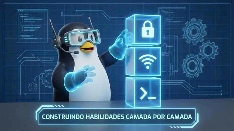 Muitos desistem de aprender hacking porque tentam começar pelo fim (tentando invadir sistemas complexos) sem ter a base necessária. Para se tornar um profissional respeitado, você precisa construir seu conhecimento em camadas, como um prédio.